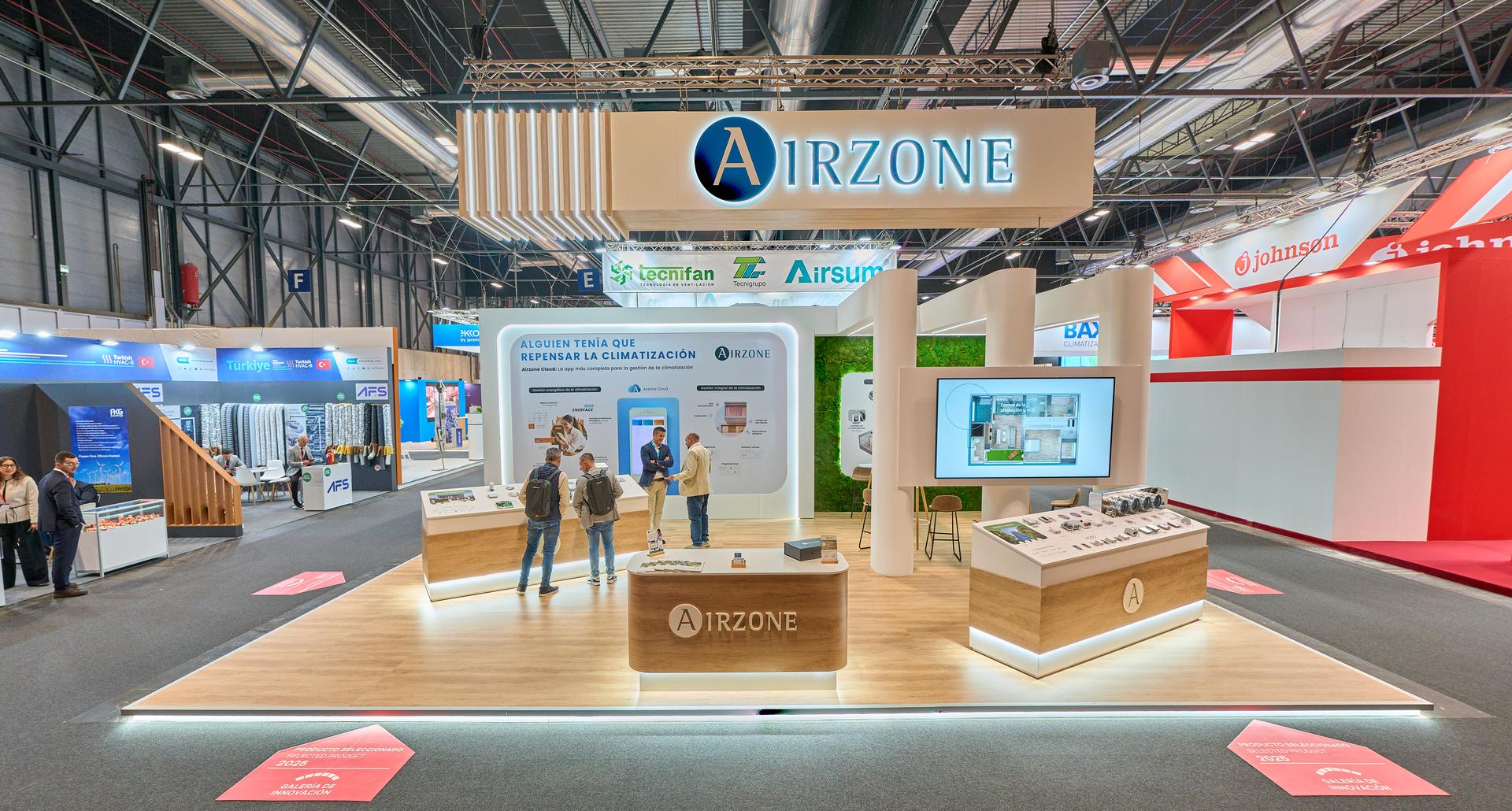 Diseñamos un espacio abierto y dinámico para este proyecto, marcado por una imponente estructura aérea suspendida que garantizó la visibilidad de la marca desde cualquier punto del pabellón. Apostamos por una combinación equilibrada de acabados en madera clara y blanco puro, creando una atmósfera profesional y acogedora a la vez. La distribución se organizó mediante grandes columnas cilíndricas blancas que estructuraron el espacio sin cerrarlo, permitiendo un flujo constante de visitantes por todo el perímetro.
