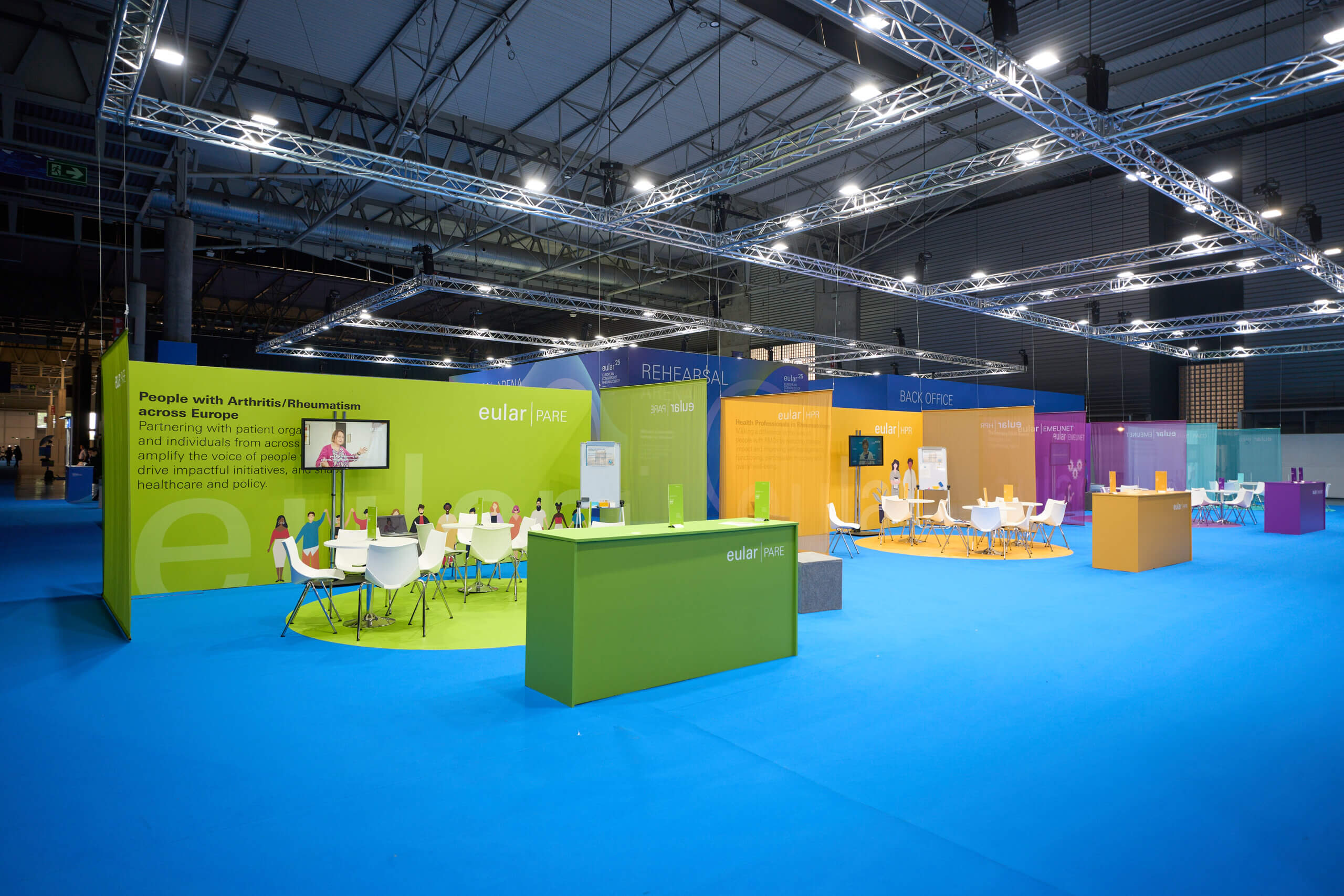 En EULAR 2025, más de 7.000 m² se destinaron a espacios de apoyo diseñados para mejorar la experiencia de los asistentes, combinando funcionalidad, diseño y claridad visual. La zona de Speakers Management, revestida en azul corporativo, ofrecía espacios cerrados para la preparación técnica de ponencias y zonas abiertas con mobiliario ligero para la espera o trabajo individual. En el corazón del evento, el EULAR Village se presentó como un entorno dinámico y accesible, con áreas diferenciadas mediante paneles de colores, mesas circulares, pantallas y mostradores, pensado para fomentar el encuentro y la interacción profesional.