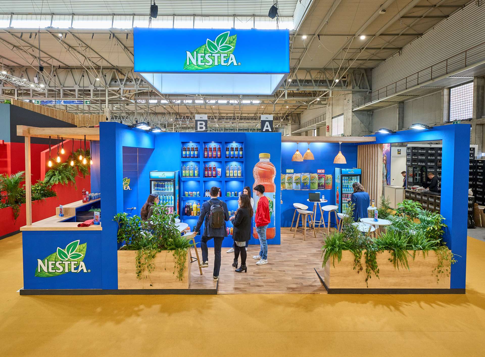 Construimos un panel expositor central con hornacinas retroiluminadas donde organizamos la gama de envases, destacando cada producto de forma individual mediante puntos de luz integrados. Integramos vitrinas refrigeradas directamente en la tabiquería y aplicamos gráficas de gran formato, incluyendo una reproducción a gran escala de la botella de limón y una composición de las diferentes variedades de latas. El mobiliario se completó con mesas altas circulares y taburetes blancos con patas de madera, distribuidos para facilitar el flujo de visitantes y la actividad comercial en el stand.