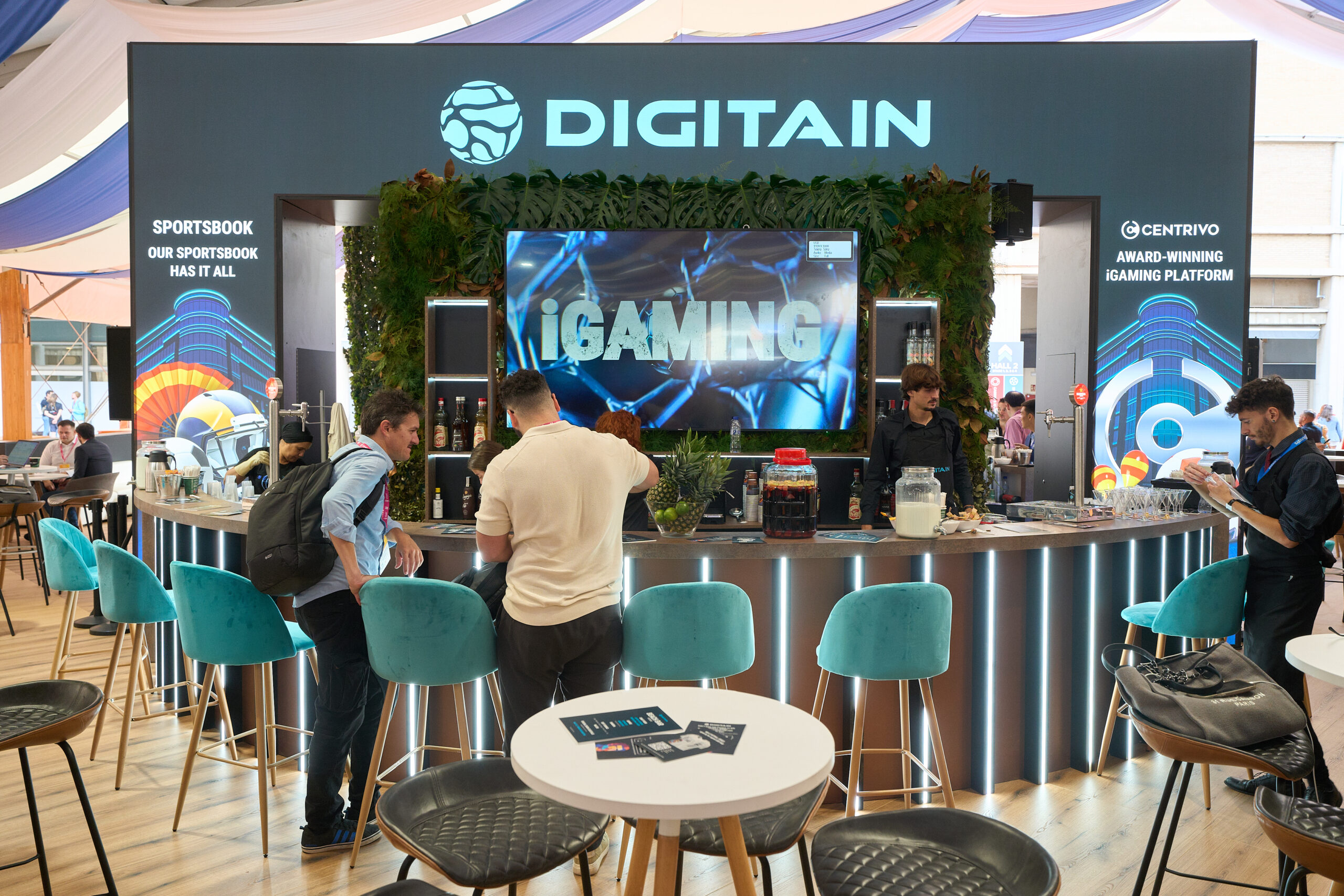 The stand featured a central bar surrounded by turquoise upholstered stools, accompanied by a backdrop with a vertical garden and the illuminated Digitain logo in large format. On both sides, LED screens and corporate graphics were integrated to reinforce the brand’s visual identity.