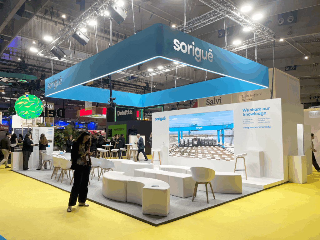 SORIGUÉ – SMART CITY EXPO 2025 SORIGUÉ – SMART CITY EXPO 2025 Once again, Sorigué has placed its trust in Servis for the design and construction of its space at the Smart City Expo World Congress in Barcelona, reaffirming a long-standing partnership built on trust and quality. The project consisted of an 80 m² island-style booth, completely open to visitors from all four sides, creating a sense of spaciousness and accessibility. At the center of the space, a curved truss structure suspended high above and finished in Sorigué’s signature corporate blue stands out. This feature, with its smooth lines and integrated perimeter lighting, adds an innovative and distinctive touch, becoming both the focal point of the design and a visual landmark within the exhibition hall. The exhibition area includes meeting zones with designer furniture in white and light wood tones, rest areas, and a coffee bar that invites conversation in a bright and comfortable environment. A large LED screen anchors the back of the booth, showcasing audiovisual content about Sorigué’s projects and technological solutions, reinforcing its message of innovation and sustainability. The overall design conveys order, clarity, and elegance, fully aligned with the brand’s values and offering an experience consistent with its identity. Each year, Servis supports Sorigué in enhancing its presence at trade fairs, maintaining a recognizable yet refreshed aesthetic that combines technology, design, and functionality. See more booths